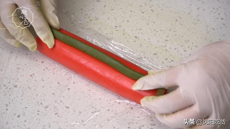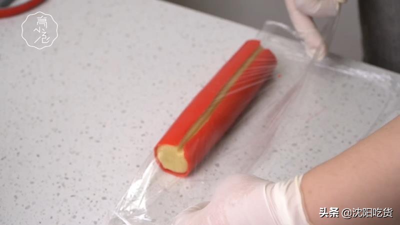 8.冷藏好的面团放到红色面片正中间,有缝隙的一面朝上,去掉不规则的边,包裹住原色面团后,包上保鲜膜,冷藏20分钟;