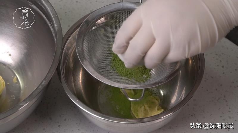 4.取一小块面团,加入抹茶粉,揉均匀,盖上保鲜膜备用;